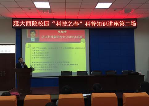 4月7日下午,在樊川讲堂隆重举行了“科技之春”科普知识讲座。理工系诚邀达内科技集团西安公司技术总监陈相峰为此次讲座主讲人,讲座由理工系副主任徐小玲主持,建工系、理工系、经管系、中文系、外语系等共计200余名师生有幸聆听讲座。陈总监以“‘互联网+’时代新兴战略型技术方向分析”为主题进行了讲演。